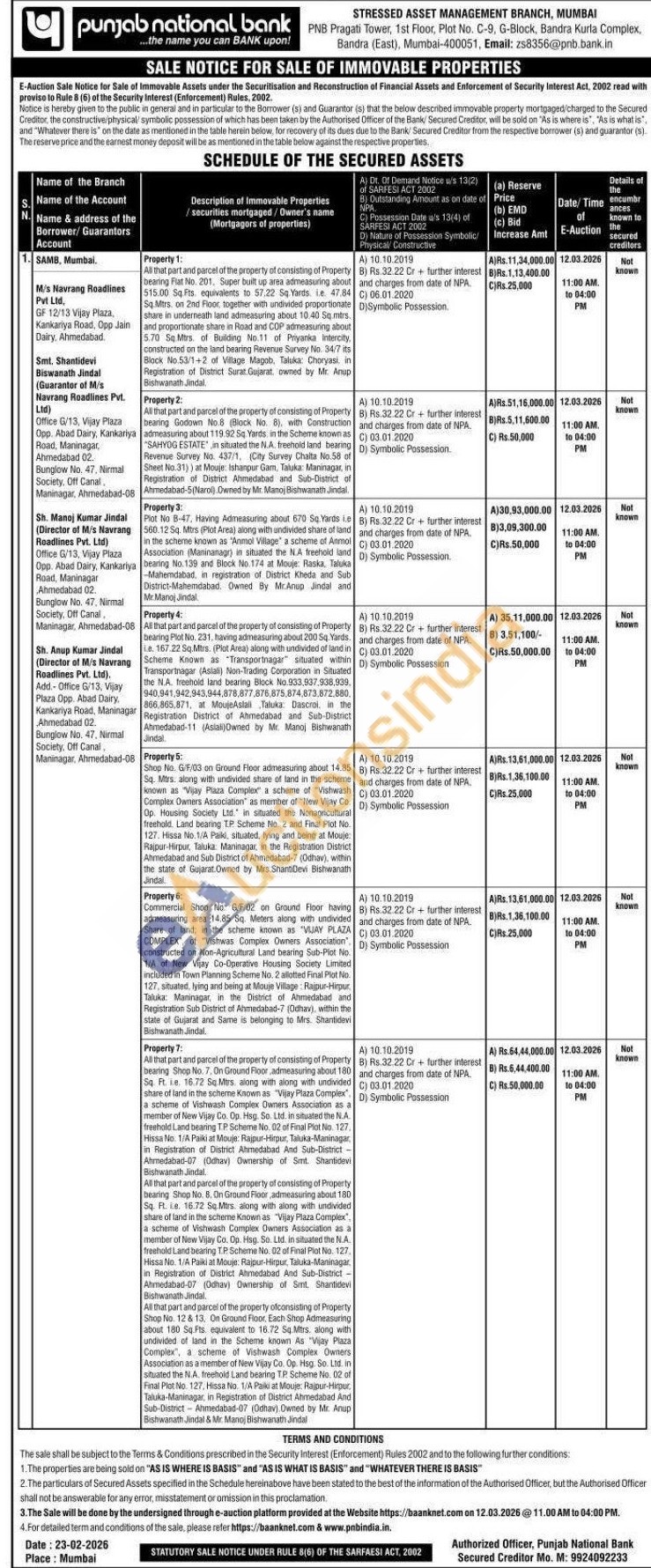 All that part and parcel of the property of consisting of Property bearing Flat No. 201, Super built up area admeasuring about 515.00 Sq. Fts, equivalents to 57.22 Sq Yards, ie. 47.84 Sq.Mtrs. on 2nd Floor, together with undivided proportionate share in underneath land admeasuring about 10.40 Sq.mtrs. and proportionate share in Road and COP admeasuring about 5.70 Sq Mtrs. of Building No.11 of Priyanka Intercity, constructed on the land bearing Revenue Survey No. 34/7 its Block No.53/1+2 of Village Magob, Taluka: Choryasi, in Registration of District Surat Gujarat, owned by Mr. Anup Bishwanath Jindal.