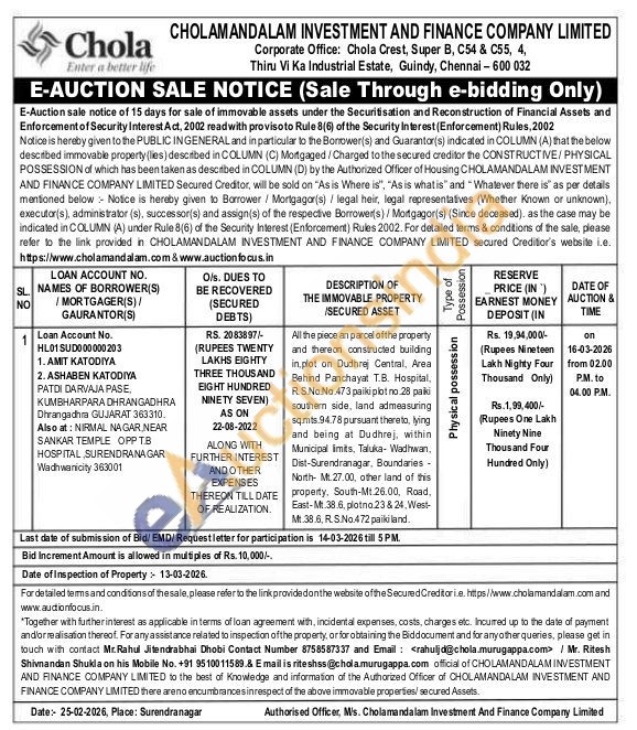 All the piece an parcel of the property and thereon constructed building in plot on Dudhrej Central, Area Behind Panchayat T.B. Hospital, R.S.No.No. 473 paiki plot no 28 paiki southern side, land admeasuring sq.mts.94.78 pursuant thereto, lying and being at Dudhrej, within Municipal imès. Taluka- Wadhwan, Dist-Surendranagar, Boundaries -North- Mt.27.00, other land of this property, South-Mt 26.00, Road, East-Mt.38.6, plotno 23 & 24, West-Mi.38.6. R.S.No.472 paiki land.