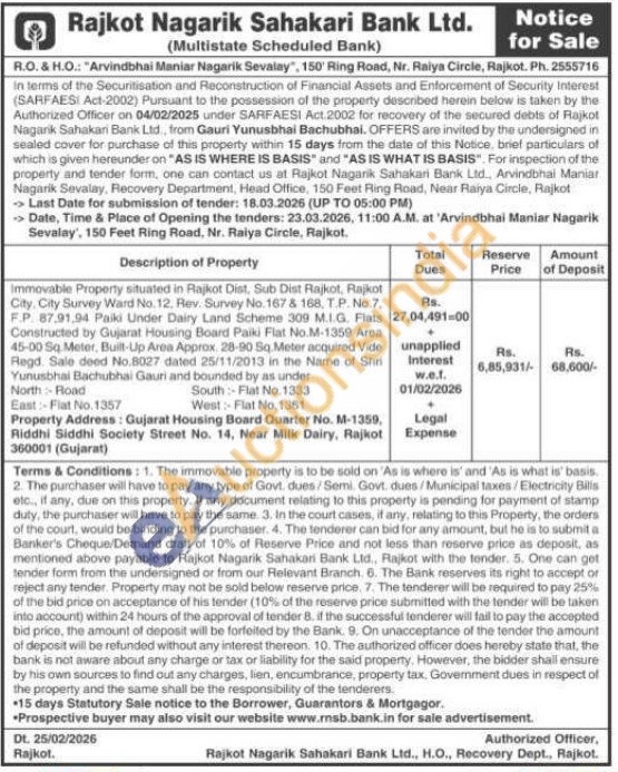Immovable Property situated in Rajkot Dist, Sub Dist Rajkot, Pajkot City, City Survey Ward No. 12. Rev. Survey No. 167 & 168, TP. No. 7. F.P. 87.91.94 Paiki Under Dairy Land Scheme 309 M.I.G. Flats Constructed by Gujarat Housing Board Paiki Flat No.M-1359 Area 45-00 Sq.Meter, Built-Up Area Approx. 28-90 Sq.Meter acquired Vide Regd. Sale deed No.8027 dated 25/11/2013 in the Name of Shri Yunusbhai Bachubhai Gaun and bounded by as under North Road