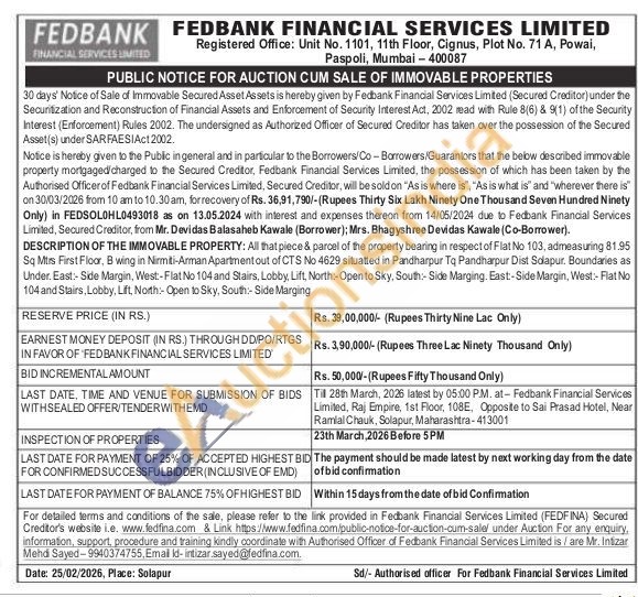 DESCRIPTION OF THE IMMOVABLE PROPERTY: All that piece & parcel of the property bearing in respect of Flat No 103, admeasuring 81.95 Sq Mirs First Floor, B wing in Nirmiti-Arman Apartment out of CTS No 4629 situatted in Pandharpur Tq Pandharpur Dist Solapur. Boundaries as Under. East:- Side Margin, West-Flat No 104 and Stairs, Lobby, Lift, North:-Open to Sky, South:- Side Marging. East-Side Margin, West:- Flat No 104 and Stairs, Lobby, Lift, North:- Open to Sky, South- Side Marging