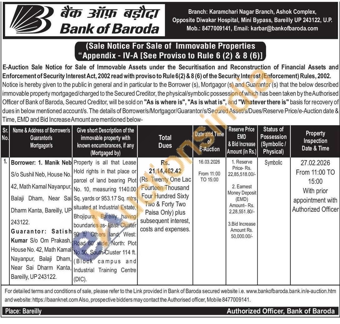Property is all that Lease Hold rights in that place or parcel of land bearing Plot No. 10, measuring 1140.00 Sq. yards or 953.17 Sq. mtrs situate situated at Industrial Estate, Bhojipura, Bareilly having boundaries as- East: Cluster 90 ft/ Others land, West: Road 60' wide, North: Plot No.56, South-Cluster 114 ft. (Block campus and Industrial Training Centre (DIC).