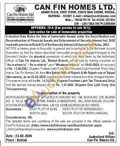 MORTGAGED PROPERTY SITUATED AT KHEWAT NO. 198, KHATA NO. 278, MURBA NO. 8, KILLA NO. 1,10,11 MIN RAKBA GOBINDPURA, HAL RAM NAGAR COLONY, ROHTAK ROAD, JIND, HARYANA-126102 ADMEASURING 80 SQ YARDS.