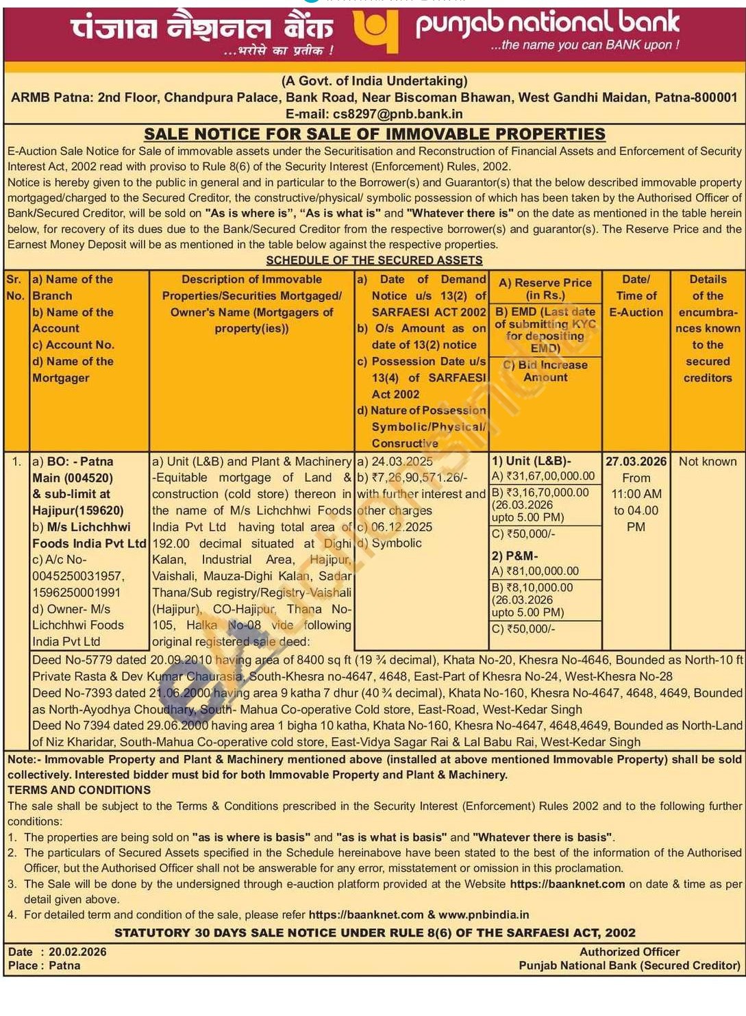 a) Unit (L&B) Equitable mortgage of Land & construction (cold store) thereon in the name of M/s Lichchhwi Foods India Pvt Ltd having total area of 192.00 decimal situated at Dighid Kalan, Industrial Area, Hajipur, Vaishali, Mauza-Dighi Kalan, Sadar Thana/Sub registry/Registry-Vaishali (Hajipur), CO-Hajipur, Thana No-105. Halka No-08 vide following original registered sale deed:Deed No-5779 dated 20.09.2010 having area of 8400 sq ft (19% decimal), Khata No-20, Khesra No-4646, Bounded as North-10 ft Private Rasta & Dev Kumar Chaurasia, South-Khesra no-4647, 4648, East-Part of Khesra No-24, West-Khesra No-28 Deed No-7393 dated 21.06.2000 having area 9 katha 7 dhur (40% decimal), Khata No-160, Khesra No-4647, 4648, 4649, Bounded as North-Ayodhya Choudhary, South- Mahua Co-operative Cold store, East-Road, West-Kedar Singh Deed No 7394 dated 29.06.2000 having area 1 bigha 10 katha, Khata No-160, Khesra No-4647, 4648,4649, Bounded as North-Land of Niz Kharidar, South-Mahua Co-operative cold store, East-Vidya Sagar Rai & Lal Babu Rai, West-Kedar Singh