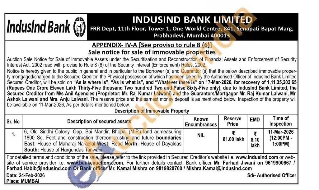 6, Old Sindhi Colony, Opp. Sai Mandir, Bhopal (M.P.) land admeasuring 1800 Sq. Feet and construction thereon existing and future boundaries East: House of Maharaj Naradlal West: Road North: House of Dayaldas South: House of Hargundas Tanwani