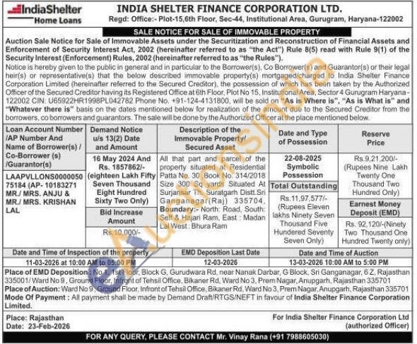 All that part and parcel of the property situated at Residential Patta No. 30, Book No. 314/2018 Size 300 Sq yards Situated At Surjansar Th. Suratgarh Distt. Sri Ganganagar (Raj) 335704. Boundary:- North: Road, South Self & Hajari Ram, East Madan Lal West: Bhura Ram