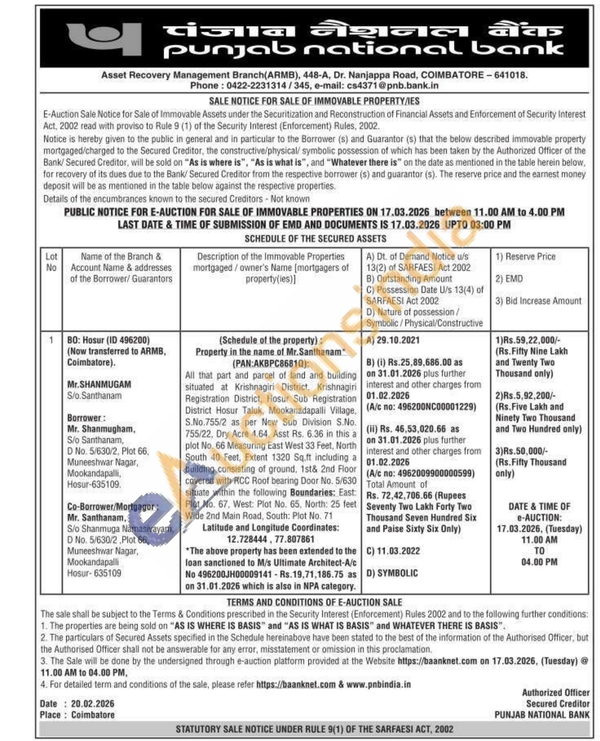 Contact no : 0422-2231314/345, e-mail: cs4371@pnb.bank.in