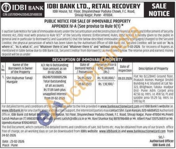 Shri. Gyan Ranjan Contact No : 020-66004122 Authorised Officer / Ms. Preeti Satish Mohan on (T) 8983070075 / Mr. Ravi Shankar Raj 8878786488 or Mr. Albert Paul 7207526931 / Mr. Upendra Kumar 8709249507