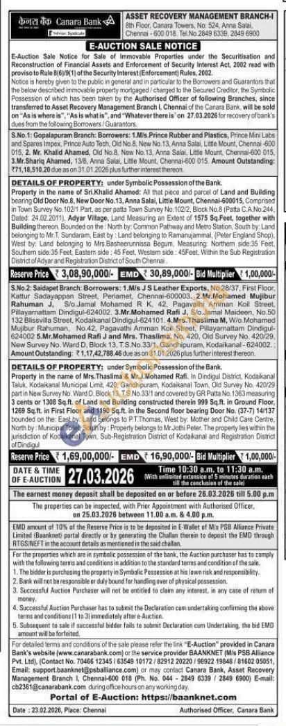 DETAILS OF PROPERTY: under Symbolic Possession of the Bank. Property in the name of Mrs. Thaslima & Mr.J.Mohamed Rafi. In Dindigul District, Kodaikanal Taluk, Kodaikanal Municipal Limit, 420, Gandhipuram, Kodaikanal Town, Old Survey No. 420/29 part in New Survey No. Ward D. Block 13, T.S No.33/1 and covered by GR Patta No. 1363 measuring 3 cents or 1308 Sq.ft. of Land and Building constructed therein 999 Sq.ft. in Ground Floor, 1269 Sq.ft. in First Floor and 1190 Sq.ft. in the Second floor bearing Door No. (37-7) 14/137 bounded on the East by: Land belongs to PT. Thomas, West by: Mother and Child Care Centre, North by: Municipal Toilet, South by: Property belongs to Mr. Jothi Peter, The property lies within the jurisdiction of Kodaikanal Town. Sub-Registration District of Kodaikanal and Registration District of Dindigul