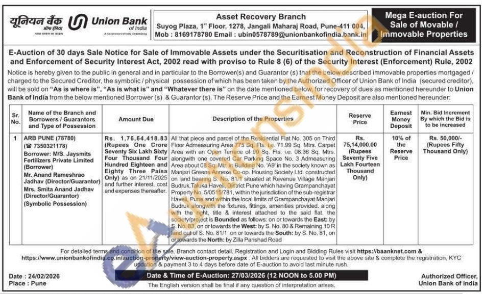 All that piece and parcel of the Residential Flat No. 305 on Third Floor Admeasuring Area 775 Sq. Fts. i.e. 71.99 Sq. Mtrs. Carpet Area with an Open Terrace of 90 Sq. Fts. i.e. 08.36 Sq. Mtrs. alongwith one covered Car Parking Space No. 3 Admeasuring Area about 08 Sq. Mtr. in Building No. 'A9' in the society known as Manjari Greens Annexe Co-op. Housing Society Ltd. constructed on land bearing S. No. 81/1 situated at Revenue Village Manjari Budruk, Taluka Haveli, District Pune which having Grampanchayat Property No. 5/0515/781, within the jurisdiction of the sub-registrar Haveli, Pune and within the local limits of Grampanchayat Manjari Budruk alongwith the fixtures, fittings, amenities provided. along with the right, title & interest attached to the said flat the society/project is Bounded as follows: on or towards the East: by S. No. 83, on or towards the West: by S. No. 80 & Remaining 10 R land out of S. No. 81/1, on or towards the South: by S. No. 81, on or towards the North: by Zilla Parishad Road