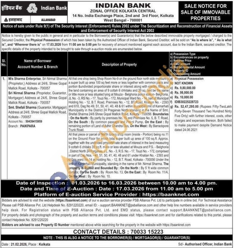 All that one shop being Shop Room No-9 on the ground floor north side measuring a super built up area 100 sq feet more or less together with common parts and portion &undivided proportionate share or interest along with electric fitting in the land containing an area of 9 cottah 6 chhitaks and 39 sq. feet be the same or little more or less situated lying at Mouza - Belghoria police station-Belghoria, JL No. -3. RS No.-17, Touzi No. -172, Municipal Ward No. -14, part of Municipal Holding No.-12. B.T. Road, Premises No. 12, BT Road, Khatian No. 2393 and 610, Dag No 49, 51, 50, 41, 40, 48 & 61 within municipal limit of Kamarhati Municipality in the District 24 Praganas North standing in the Name of Smt. Shefali Sharma 24/6 Shree Gopal Mallick Road, Kolkata-700056. Boundaries : On the North: By partly by premises No. 15 and Premises No. 5. B. T. Road, On the South By common passage and Petrol Pump. On the East: By remaining portion of Land of Adhir Chandra Das, On the West: By Barrackpore Trunk Road