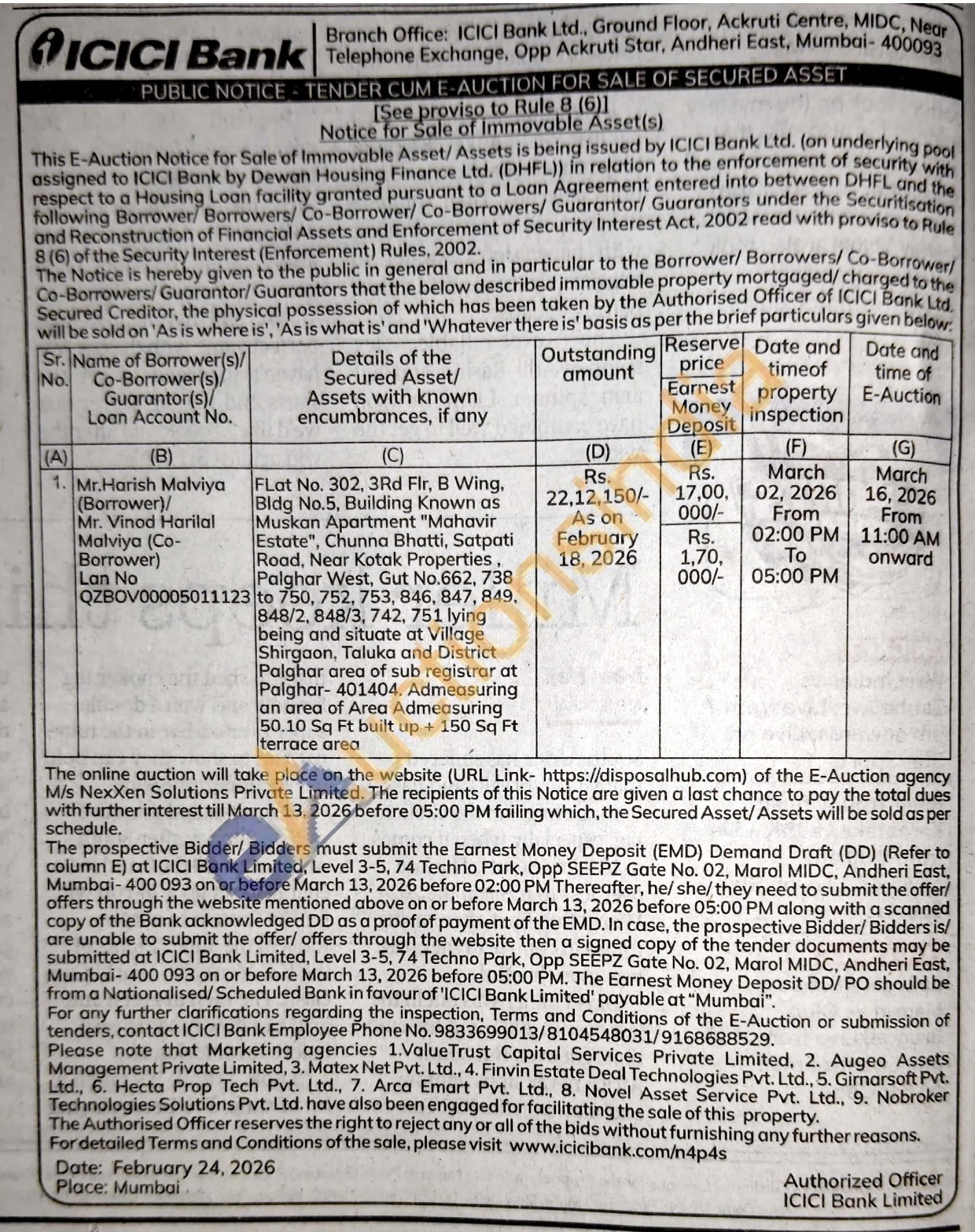 FLat No. 302, 3Rd Flr, B Wing. Bldg No.5, Building Known as Muskan Apartment "Mahavir Estate", Chunna Bhatti, Satpati Road, Near Kotak Properties Palghar West, Gut No.662, 738 to 750, 752, 753, 846, 847, 849, 848/2, 848/3, 742, 751 lying being and situate at Village Shirgaon, Taluka and District Palghar area of sub registrar at Palghar-401404. Admeasuring an area of Area Admeasuring 50.10 Sq Ft built up + 150 Sq Ft terrace area