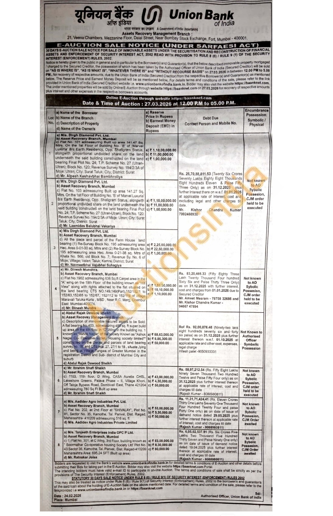 Description of immovable secured assets to be Sold: A flat bearing No.403, admeasuring 485 sq. ft super build up area on the 4th floor in "C" Wing in the building no. 1 known as "Ashok Nagar" of the society Known as "Ashok Nagar Co-Operative society Housing society limited constructed on the pieces and parcels of land bearing survey no. 16 and CTS nos. 27, 27/1 to 18, situate, lying and being at Village Tungwa of Greater Mumbai in the registration District and Sub-district of Mumbai City and suburb