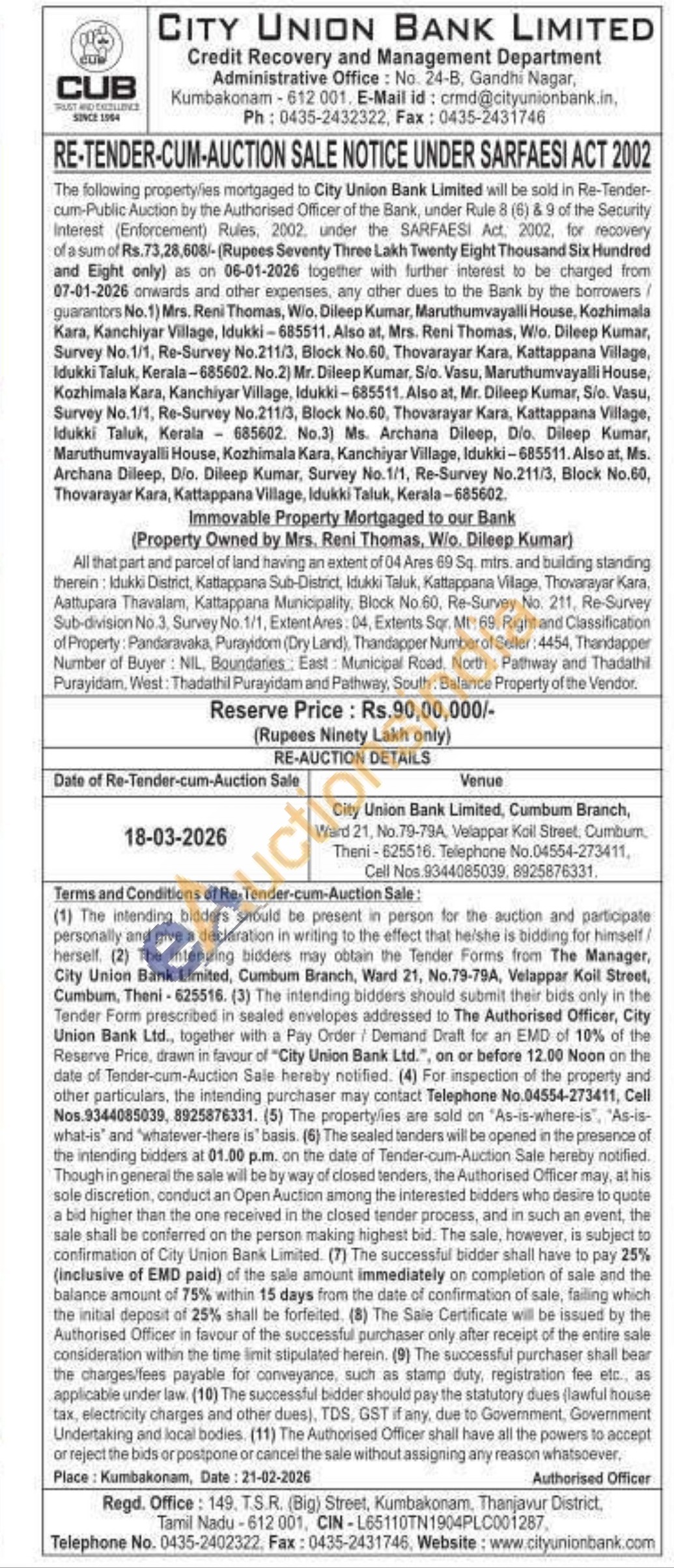 All that part and parcel of land having an extent of 04 Ares 69 Sq. mirs, and building standing therein: Idukki District, Kattappana Sub-District, Idukki Taluk, Kattappana Village, Thovarayar Kara, Aattupara Thavalam, Kattappana Municipality, Block No.60, Re-Survey No. 211, Re-Survey Sub-division No.3. Survey No. 1/1, Extent Ares: 04, Extents Sor. Mt: 69, Right and Classification of Property: Pandaravaka, Purayidom (Dry Land), Thandapper Number of Seller: 4454, Thandapper Number of Buyer: NIL, Boundaries, East: Municipal Road, North Pathway and Thadathi Purayidam, West: Thadathi Purayidam and Pathway, South: Balance Property of the Vendor