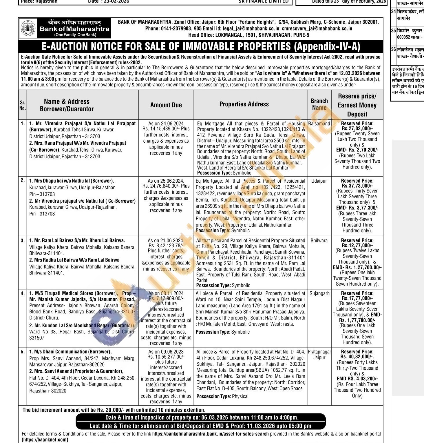 All that piece and Parcel of Residential Property Situated at Patta No. 29, Village Kaliya Khera, Bairwa Mohalla, Gram Panchayat Reechhada, Panchayat Samiti Suwana, Tehsil & District, Bhilwara, Rajasthan-311401 Admeasuring 2531 Sq. Ft. in the name of Mr. Ram Lal Bairwa, Boundaries of the property: North: Abadi Padat, East: Property of Tulsi Ram, South: Road, West: Abadi Padat Possession Type: Symbolic