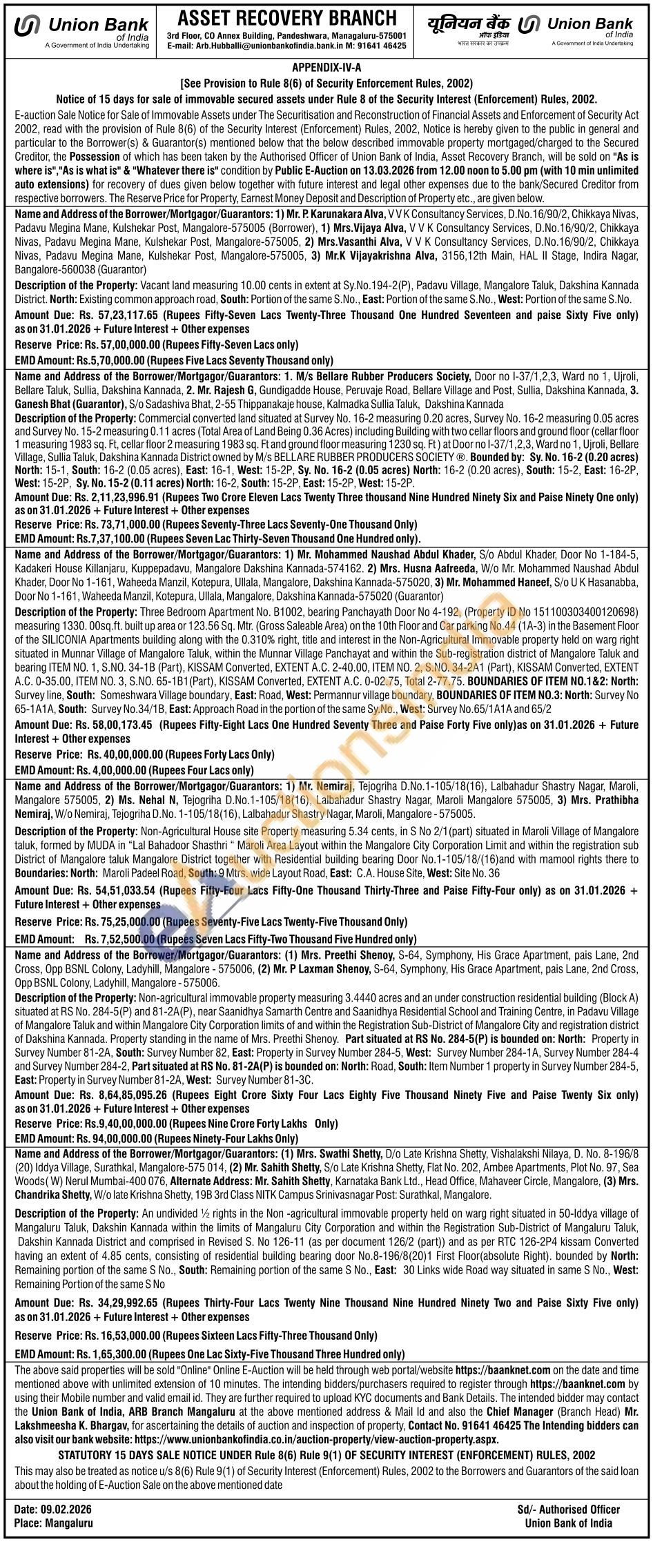 Description of the Property: An undivided 1/½ rights in the Non-agricultural immovable property held on warg right situated in 50-Iddya village of Mangaluru Taluk, Dakshin Kannada within the limits of Mangaluru City Corporation and within the Registration Sub-District of Mangaluru Taluk, Dakshin Kannada District and comprised in Revised S. No 126-11 (as per document 126/2 (part)) and as per RTC 126-2P4 kissam Converted having an extent of 4.85 cents, consisting of residential building bearing door No.8-196/8(20)1 First Floor(absolute Right), bounded by North: Remaining portion of the same S No., South: Remaining portion of the same S No., East: 30 Links wide Road way situated in same S No., West: Remaining Portion of the same S No