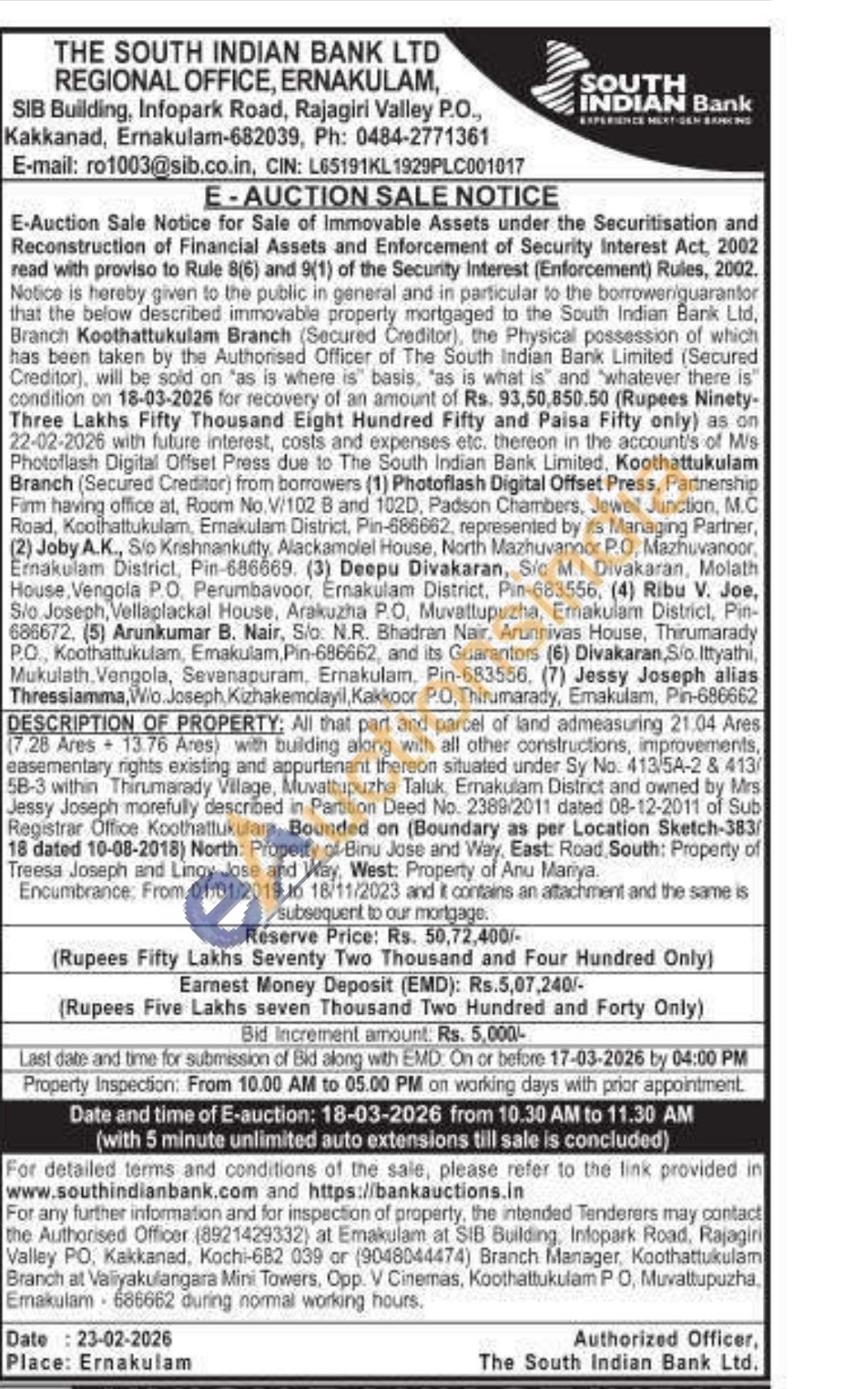17.28 Ares 13.76 Ares) with building along with all other constructions, iniprovements, easementary rights existing and appurtenant thereon situated under Sy No. 413/5A-2 & 413 5B-3 within Thirumarady Village, Muvattupuzha Taluk, Ernakulam District and owned by Mrs Jessy Joseph morefully described in Partition Deed No. 2389/2011 dated 08-12-2011 of Sub Registrar Office Koothattukulam. Bounded on (Boundary as per Location Sketch-383/18 dated 10-08-2018) North: Property of Binu Jose and Way, East: Road, South: Property of Treesa Joseph and Linoy Jose and Way, West: Property of Anu Mariya