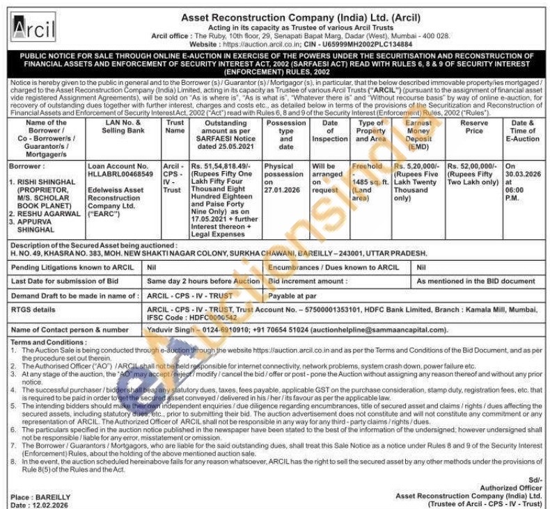 Description of the Secured Asset being auctioned: H. NO. 49, KHASRA NO. 383, MOH. NEW SHAKTI NAGAR COLONY, SURKHA CHAWANI, BAREILLY-243001, UTTAR PRADESH