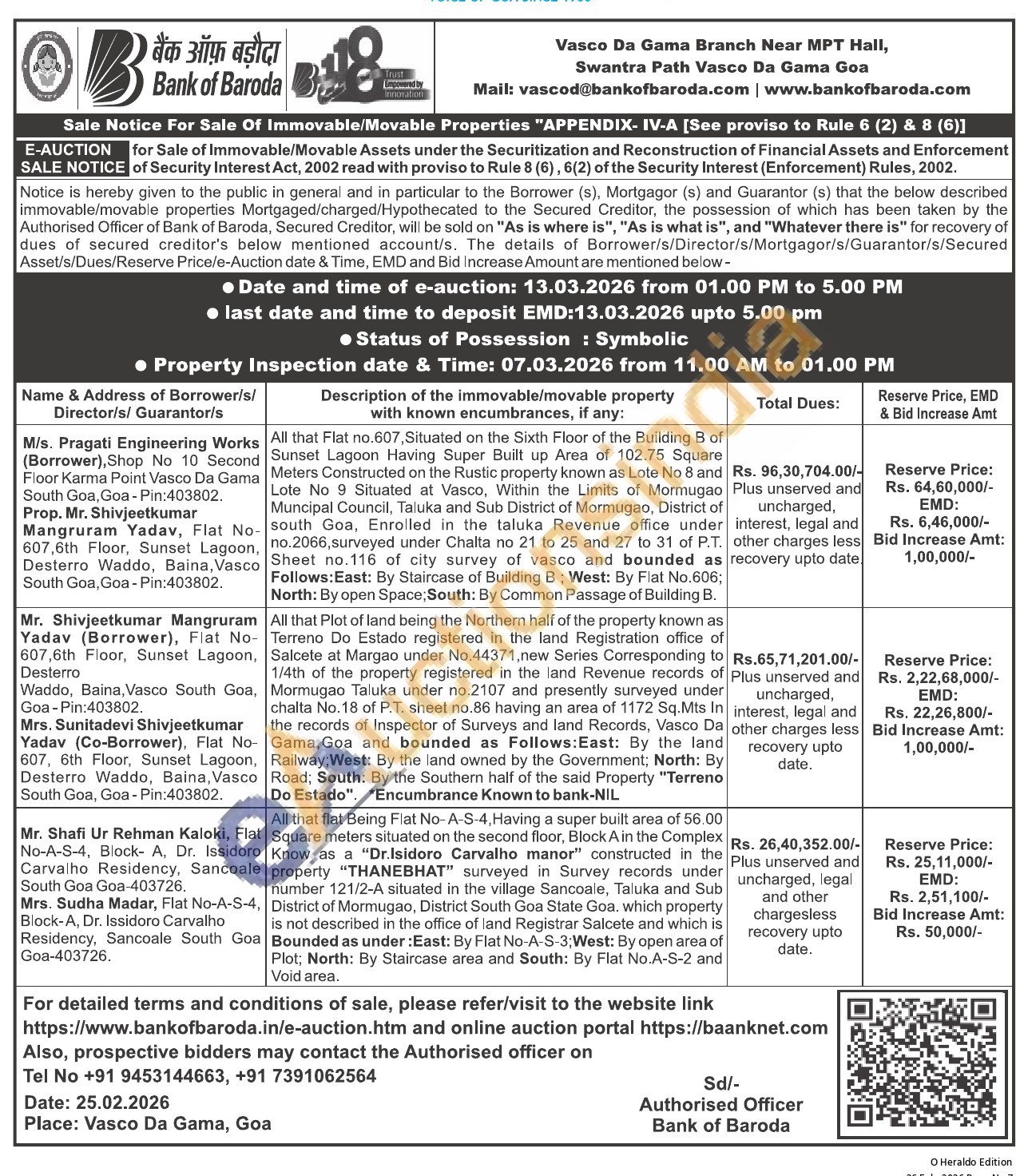 contact the Authorised officer on Tel No +91 9453144663, +91 7391062564