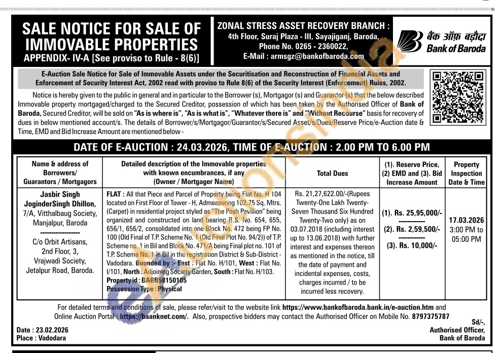 located on First Floor of Tower - H, Admeasuring 102.75 Sq. Mtrs. (Carpet) in residential project styled as "The Posh Pavillion" being organized and constructed on land bearing R.S. No. 654, 655, 656/1, 656/2, consolidated into one Block No. 472 being FP No. 100 (Old Final of T.P. Scheme No. 1 (Old Final Plot No. 94/2)) of T.P. Scheme no. 1 in Bil and Block No. 471/A being Final plot no. 101 of T.P. Scheme No. 1 in Bil in the registration District & Sub-District -Vadodara. Bounded by:- East: Flat No. H/101, West: Flat No. 1/101, North: Adjoining Society Garden, South: Flat No. H/103.