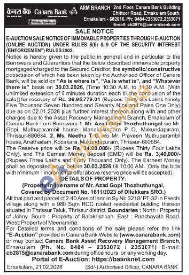 All that part and parcel of 2.40 Ares of land in Sy No.3218/PT-32 in Peechi village along with a 980 Sqm RCC roofed residential building thereon situated in Thrissur Taluk, Thrissur district. Boundaries: North: Property of Johny. South Property of Balakrishnan. East: Panchayath Road. West: Property of Meenamma
