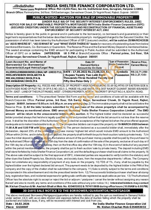 Description Of Property: ALL PIECES AND APRCEL OF PROPERTY AREA ADMEASURING 55.69 SQ.MTRS OF EASTERN SIDE & SOUTH SIDE ROAD OF PLOT NO.19 OF R.S NO.102/1-2, PAIKEE VILLAGE RAIYA TA & DIST RAJKOT GUJARAT 360005 BOUNDED WITH: EAST: LAND OF THIS PLOT PAIKEE, WEST: OTHERS PROPERTY, NORTH: PROPERYT OF PLOT NO.14, SOUTH: ROAD