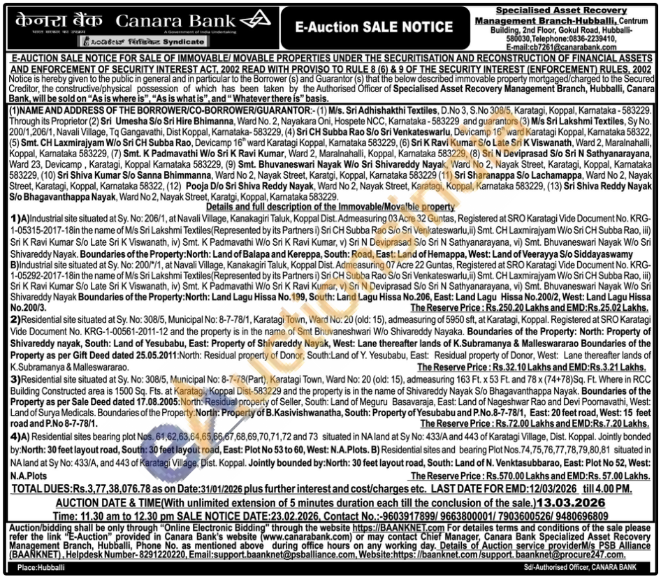 1)A) Industrial site situated at Sy. No: 206/1, at Navali Village, Kanakagiri Taluk, Koppal Dist. Admeasuring 03 Acre 32 Guntas, Registered at SRO Karatagi Vide Document No. KRG-1-05315-2017-18in the name of M/s Sri Lakshmi Textiles (Represented by its Partners i) Sri CH Subba Rao S/o Sri Venkateswarlu, ii) Smt. CH Laxmirajyam W/o Sri CH Subba Rao, iii) Sri K Ravi Kumar S/o Late Sri K Viswanath, iv) Smt. K Padmavathi W/o Sri K Ravi Kumar, v) Sri N Deviprasad S/o Sri N Sathyanarayana, vi) Smt. Bhuvaneswari Nayak W/o Sri Shivareddy Nayak. Boundaries of the Property: North: Land of Balapa and Kereppa, South: Road, East: Land of Hemappa, West: Land of Veerayya S/o Siddayaswamy B)Industrial site situated at Sy. No: 200/*/1, at Navali Village, Kanakagiri Taluk, Koppal Dist. Admeasuring 07 Acre 22 Guntas, Registered at SRO Karatagi Vide Document No. KRG-1-05292-2017-18in the name of M/s Sri Lakshmi Textiles (Represented by its Partners i) Sri CH Subba Rao S/o Sri Venkateswarlu,ii) Smt. CH Laxmirajyam W/o Sri CH Subba Rao, iii) Sri K Ravi Kumar S/o Late Sri K Viswanath, iv) Smt. K Padmavathi W/o Sri K Ravi Kumar, v) Sri N Deviprasad S/o Sri N Sathyanarayana, vi) Smt. Bhuvaneswari Nayak W/o Sri Shivareddy Nayak Boundaries of the Property: North: Land Lagu Hissa No. 199, South: Land Lagu Hissa No.206, East: Land Lagu Hissa No.200/2, West: Land Lagu Hissa No.200/3