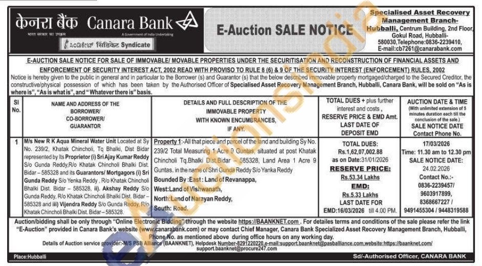 Property 1:-All that piece and parcel of the land and building Sy No. 239/2 Total Measuring 1 Acre 9 Guntas, situated at post Khatak Chincholi Tq. Bhalki Dist. Bidar - 585328, Land Area 1 Acre 9 Guntas, in the name of Shri Gunda Reddy Sio Yanka Reddy Bounded By: East: Land of Revanappa, West: Land of Vishwanath, North: Land of Narayan Reddy, South: Road.