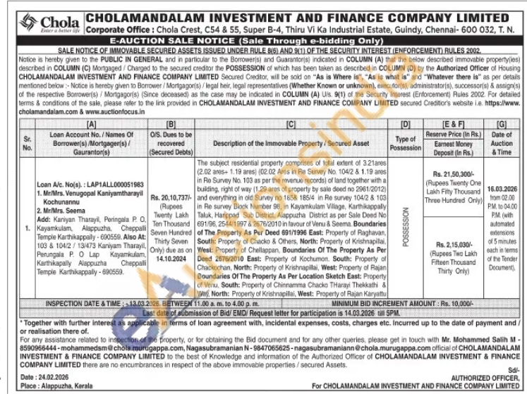 The subject residential property comprises of total extent of 3:21ares (2.02 ares+ 1.19 ares) (02.02 Ares in Re Survey No. 104/2 & 1.19 ares in Re Survey No. 103 as per the revenue records) of land together with a building, right of way (1.29 ares of property by sale deed no 2961/2012) and everything in old Survey no 1858 185/4 in Re survey 104/2 & 103 in Re survey Block Number 98, in Kayamkulam Village, Karthikappally Taluk, Harippad Sub District. Alappuzha District as per Sale Deed No 691/96. 2544/1997 & 2676/2010 in favour of Venu & Seema Boundaries. of The Property As Per Deed 691/1996 East: Property of Raghavan. South: Property of Chacko & Others, North: Property of Krishnapillai West: Property of Chellappan, Boundaries Of The Property As Per Deed 2676/2010 East: Property of Kochumon. South: Property of Chackochan, North: Property of Krishnapilai, West: Property of Rajan Boundaries Of The Property As Per Location Sketch East: Property of Venu, South: Property of Chinnamma Chacko Harayl Thekkathi & Way, North: Property of Krishnapillai, West: Property of Rajan Karyaltu