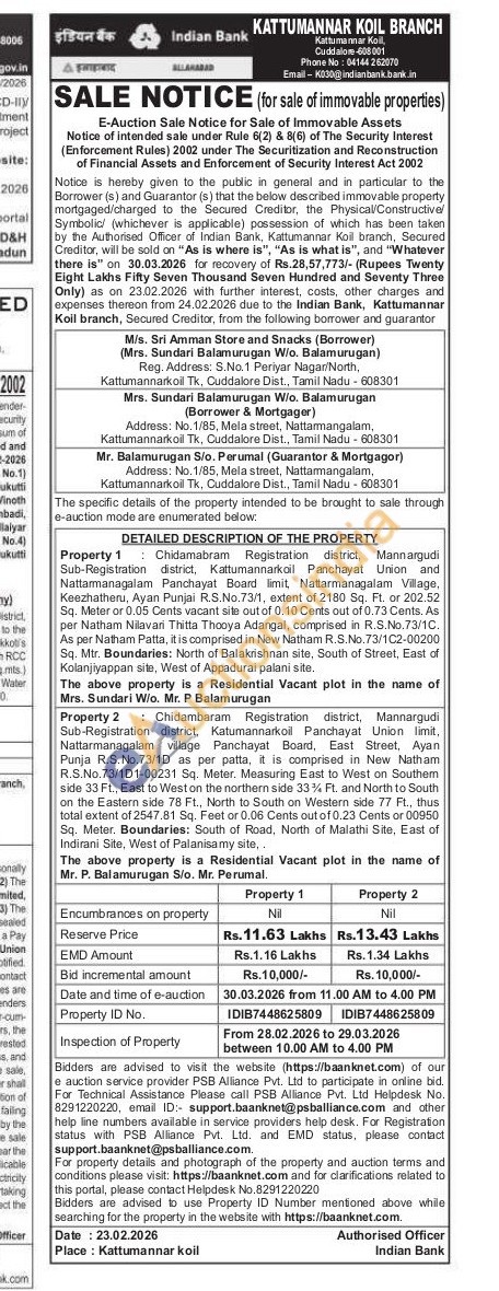 Property 1: Chidamabram Registration district, Mann argudi Sub-Registration district, Kattumannarkoil Panchayat Union and Nattarmanagalam Panchayat Board limit Natarmanagalam Village, Keezhatheru, Ayan Punjai R.S.No. 73/1, extent of 2180 Sq. Ft. or 202.52 Sq. Meter or 0.05 Cents vacant site out of 0.10 Cents out of 0.73 Cents. As per Natham Nilavari Thitta Thooya Adangal, comprised in R.S.No. 73/10. As per Natham Patta, & is comprised in New Natham R.S.No.73/1C2-00200 Sq. Mtr. Boundaries: North of Balakrishnan site, South of Street, East of Kolanjiyappan site, West of Appadurai palani site,