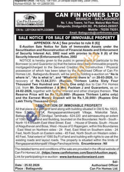 All that piece and parcel of land along with building situated in Old S.No. 182/2. New S.No. 216/1A, Rengappanaickkenpatti Village, Nilakottai Taluk, Batlagundu Sub-D, Dindigul, Tamilnadu-624 220 and admeasuring an extent of 1080 Sq.ft of land and Building, bounded on the Boundaries: North-South-North 15 ft breadth East West Street. East House of Sheela, South-House of Alaguthevan and Bose, West-House of O Rajangam, within this Boundaries East West on Northern sides 24 Feet, East West on Southern sides-24 Feet, North South on Eastern sides-45 Feet, North South on Western sides-45 Feet, Total extent of 1080 Sq Ft of land and building with rights to use all the existing roads and layout roads. The property is situated within the limits of Rengappanaickkenpatti Village Panchayat limits