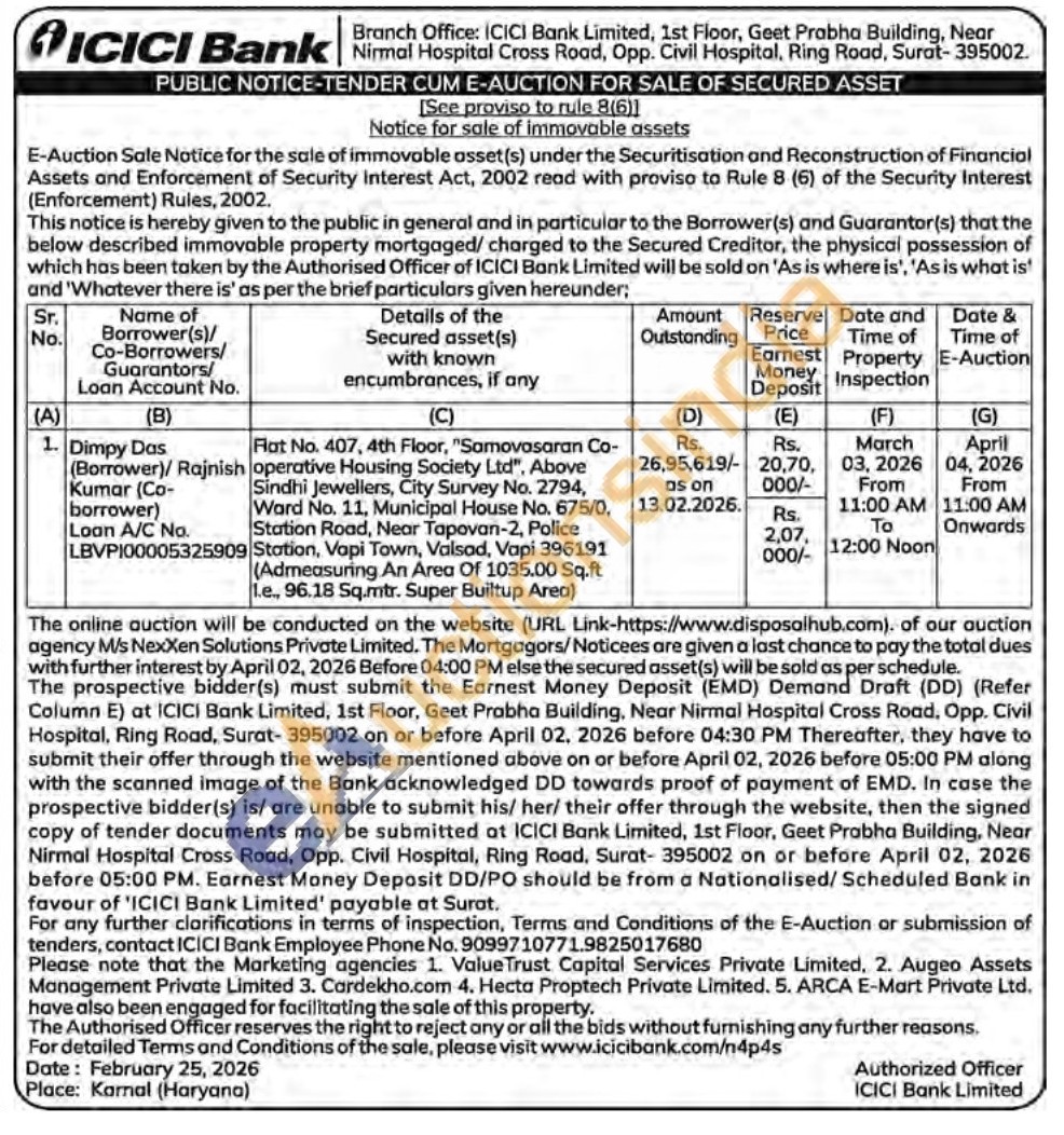 Flat No. 407, 4th Floor, "Samovasaran Co-operative Housing Society Ltd", Above Sindhi Jewellers, City Survey No. 2794, Ward No. 11, Municipal House No. 675/0, Station Road, Near Tapovan-2, Police (Admeasuring An Area Of 1035.00 Sq.ft 1.e., 96.18 Sq.mtr. Super Builtup Area) Station, Vapi Town, Valsad, Vapi 396191