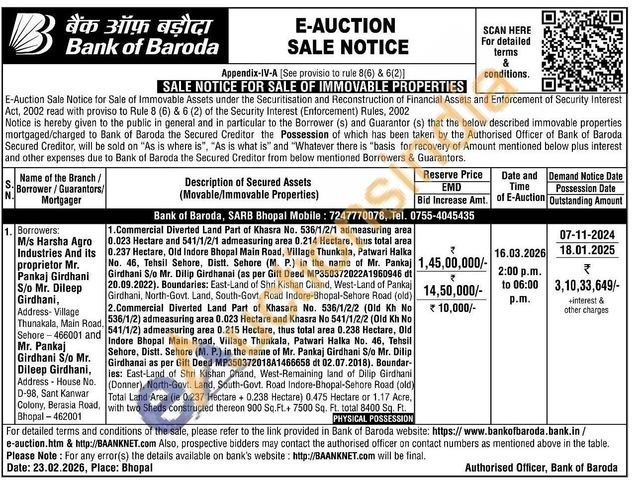 1.Commercial Diverted Land Part of Khasra No. 536/1/2/1 admeasuring area 0.023 Hectare and 541/1/2/1 admeasuring area 0.214 Hectare, thus total area 0.237 Hectare, Old Indore Bhopal Main Road, Village Thunkala, Patwari Halka No. 46, Tehsil Sehore, Distt. Sehore (M. P.) in the name of Mr. Pankaj Girdhani S/o Mr. Dilip Girdhanai (as per Gift Deed MP350372022A1960946 dt 20.09.2022). Boundaries: East-Land of Shri Kishan Chand, West-Land of Pankaj Girdhani, North-Govt. Land, South-Govt. Road Indore-Bhopal-Sehore Road (old) 2.Commercial Diverted Land Part of Khasara No. 536/1/2/2 (Old Kh No 536/1/2) admeasuring area 0.023 Hectare and Khasra No 541/1/2/2 (Old Kh No 541/1/2) admeasuring area 0.215 Hectare, thus total area 0.238 Hectare, Old Indore Bhopal Main Road, Village Thunkala, Patwari Halka No. 46, Tehsil Sehore, Distt. Sehore (M. P.) in the name of Mr. Pankaj Girdhani S/o Mr. Dilip Girdhanai as per Gift Deed MP350372018A1466658 dt 02.07.2018). Boundar-ies: East-Land of Shri Kishan Chand, West-Remaining land of Dilip Girdhani (Donner), North-Govt. Land, South-Govt. Road Indore-Bhopal-Sehore Road (old) Total Land Area (ie 0.237 Hectare + 0.238 Hectare) 0.475 Hectare or 1.17 Acre, with two Sheds constructed thereon 900 Sq.Ft.+ 7500 Sq. Ft. total 8400 Sq. Ft.
