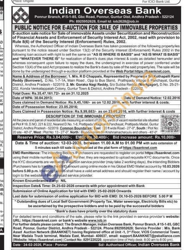 All the piece and parcel of residential site measuring an extent of 120 Sq. yards of vacant residential site situated at Plot#19, D.NO, 221 & 222, Nearest D. No. 1-8, Prattipadu Village and Panchayat, Prattipadu Madal, Guntur District, Andhra Pradesh-522019 Common Boundaries: East: 20 ft wide Road-27-0", South: Plot No: 20 site-40-0", West: Plot No: 13-27-0", North: Brundavanam Sri Krishnamacharyulu and others-40-0