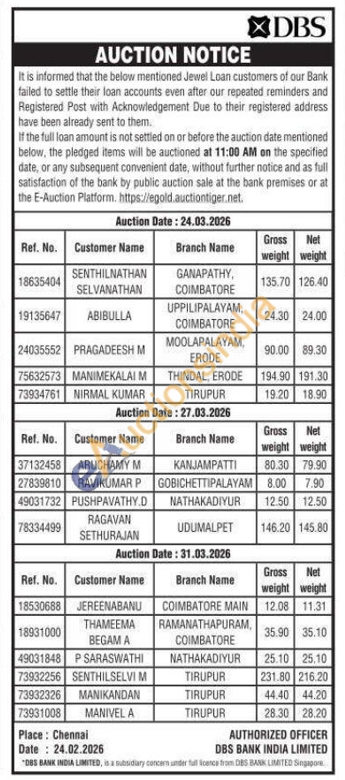DBS Bank India Limited Gold Auctions Auction in Coimbatore