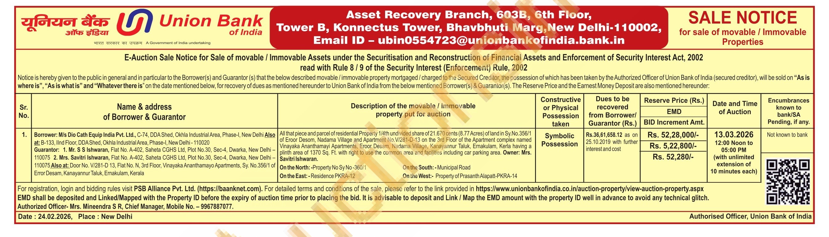All that piece and parcel of residential Property 1/4m undivided share of 21.670 cents (8.77 Acres) of landin Sy No.356/1 of Eroor Desom, Nadama Village and Apartiment No VW281-D-13 on the 3rd Floor of the Apartment complex named Vinayaka Ananthamayi Apartmanis, Ercor Desam, Nadama Vilage. Kanayannur Taluk, Ernakulam, Kerla having a plinth area of 1370 Sq. Ft. with right to use the common area and facilities including car parking area. Owner: Mrs. Savitri Ishwaran.