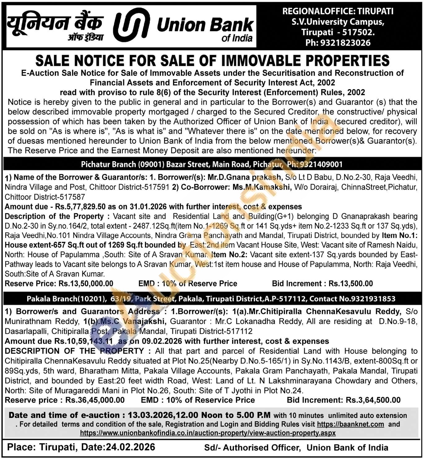 Vacant site and Residential Land and Building(G+1) belonging D Gnanaprakash bearing D.No.2-30 in Sy.no. 164/2, total extent - 2487.12Sq.ft(item No.1-1269 Sq.ft or 141 Sq.yds+ item No.2-1233 Sq.ft or 137 Sq.yds), Raja Veedhi, No. 101 Nindra Village Accounts, Nindra Grama Panchayath and Mandal, Tirupati District, bounded by Item No.1: House extent-657 Sq.ft out of 1269 Sq.ft bounded by East:2nd item Vacant House Site, West: Vacant site of Ramesh Naidu, North: House of Papulamma, South: Site of A Sravan Kumar. Item No.2: Vacant site extent-137 Sq.yards bounded by East-Pathway leads to Vacant site belongs to A Sravan Kumar, West: 1st item house and House of Papulamma, North: Raja Veedhi, South: Site of A Sravan Kumar.