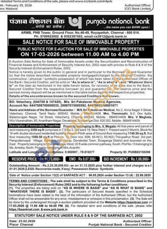 All that piece and parcel of land measuring 3350 sq.ft comprises in TS No 3, Old ward 18, New Ward 1, Present ward 2 Ward A, Block No 16 with double storeyed residential building thereon Plinth area of Ground floor measuring 1740.50 sq.ft, first floor measuring 1500.50 sq.ft at Plot no. 12, Door nos. 65N, 65-N(1), 65-N(2) Thirupathur Road, 3rd part, Panipullanvayal Village, Kannankottai Group, Devakottai Town, Sivaganga District and bounded on the, East Property belonging to Chidambaram, West: 20 ft wide common pathway, South: Plot No. 13 belonging to Ms. Ambika, North: Property belonging to Mrs. Ananthi