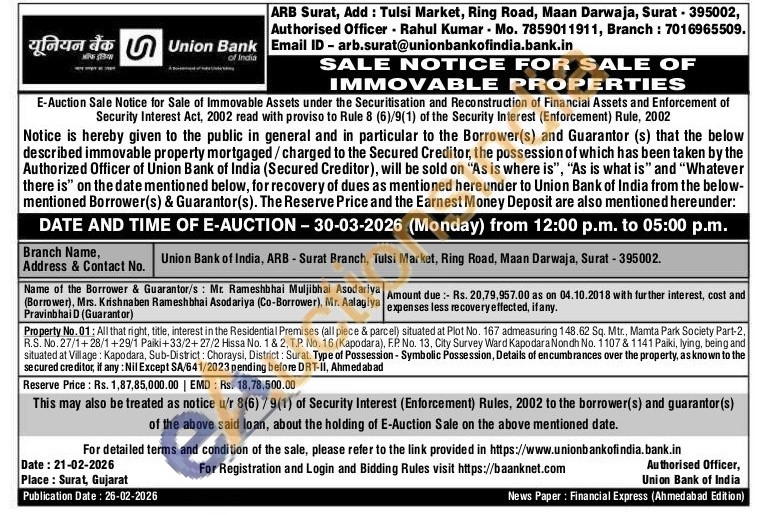 Contact Authorised Officer Rahul Kumar Mo. 7859011911, Branch: 7016965509 Email ID-arb.surat@unionbankofindia.bank.in