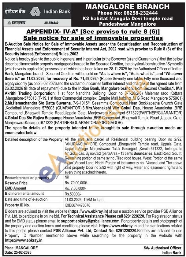 All the part and parcel of Residential building bearing Door no 2/92, "ANURAKSHA" BRB Compound, Bhagavathi Temple road, Uppala Gate, Uppala Village Manjeshwara Taluk Kasargod, Kerala-671322, belongs to Mr. Gokuldas. Sy no 63/2 (part) Area-13 cents Boundaries: East: Road, South: Remaining portion of same sy no, Tiled rood house, West: Portion of the same sy no, Vacant Land, North: Portion of the same sy no, Vacant Land The above said property Door no 2/92 with right of way, water and easement rights and every thing attached thereto.