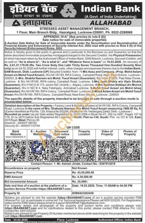 Factory Land & Building situated at 541R/185, RIFA Colony, Campwell Road, Lucknow in the name of Mrs. Shakeela Nasreen W/o Mohd Yusuf Ansari measuring 1800.00 Sq. ft. (Earlier identified as Plot No. 129, Khasra No 552(M), situated at Vill-Haiderganj Zadid, Distt-Lucknow.) Bounded as under (as per Sale added Registered on 30.03.2006 in Book No-01, Zild no-3297, Pages 157 to 178, Sr no 2670 before Sub Registered 4th Lucknow):-North: Plot no-130, South: Plot no.127 & 128, East: 20 ft Road, West: Plot no-30