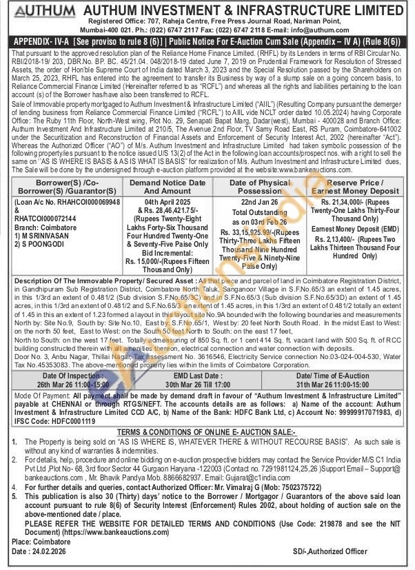 Description Of The Immovable Property/Secured Asset: All that piece and parcel of land in Coimbatore Registration District, in Gandhipuram Sub Registration District, Coimbatore North Taluk, Sanganoor Village in S.F.No.65/3 an extent of 1.45 acres, in this 1/3rd an extent of 0.481/2 (Sub division S.F.No.65/3C) and in S.F.No.65/3 (Sub division S.F.No.65/3D) an extent of 1.45. acres, in this 1/3rd an extent of 0.48 1/2 and S.F.No.65/3 an extent of 1.45 acres, in this 1/3rd an extent of 0.48 1/2 totally an extent of 1.45 in this an extent of 1.23 formed a layout in this layout site No. 9A bounded with the following boundaries and measurements North by: Site No.9, South by: Site No. 10, East by: S.F.No.65/1, West by: 20 feet North South Road. In the midst East to West: on the north 50 feet, East to West: on the South 50 feet North to South: on the east 17 feet,