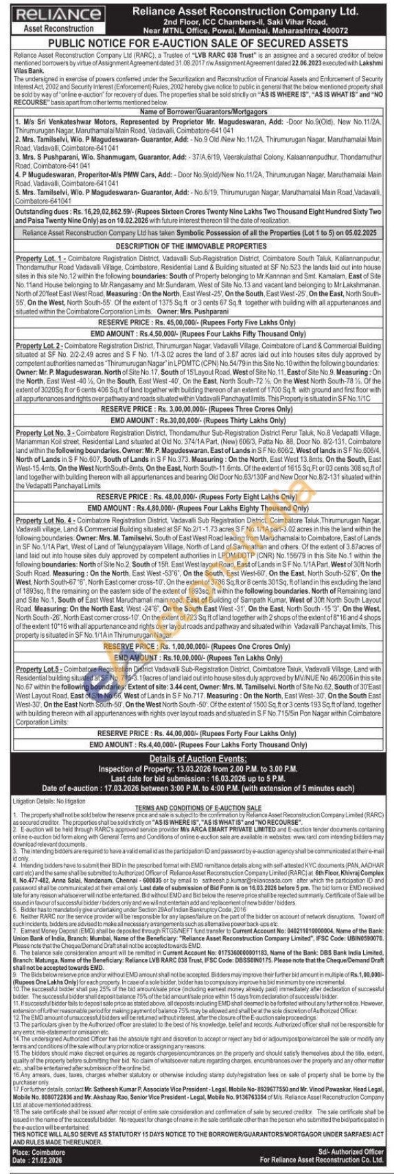 Property Lot. 2-Coimbatore Registration District, Thirumurgan Nagar, Vadavalli Village, Coimbatore of Land & Commercial Buliding situated at SF No. 2/2-2.49 acres and S F No. 1/1-3.02 acres the land of 3.87 acres laid out into houses sites duly approved by competent authorities named as "Thirumurugan Nagar" in LPDMTC (CPN) No.54/79 in this Site No. 10 within the following boundaries: Owner: Mr. P. Magudeswaran. North of Site No. 17, South of 15 Layout Road, West of Site No. 11, East of Site No.9. Measuring: On the North, East West -40%, On the South, East West-40, On the East, North South-72%. On the West North South-78%. Of the extent of 3020Sq.ft or 6 cents 406 Sq.ft of land together with building thereon of an extent of 1700 Sq.ft with ground and first floor with all appurtenances and rights over pathway and roads situated within Vadavalli Panchayat limits. This Property is situated in SF No.1/1C
