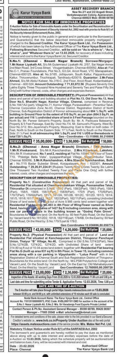 DESCRIPTION OF IMMOVABLE PROPERTY: (Physical Possession) All that piece and parcel of land and building situated at Plot No.13, Old Door No.13, New Door No.5, Bharathi Nagar, Konnur Village, Chennal, comprised in Revenue S.No 194/1A2 (part), Village No. 71, Konnur Village, Purasawalkam-Perambur Taluk Chennal Corporation Zone No 63, Chennai District, Registration District of North Chennai, Sub-Registration District of Konnur admeasuring about 604% Sq.Ft. with building in Ground Floor to the extent of 510 Sq.Ft. as per plan (604.5 Sq.Ft. as per actual) and 116% undivided share of land in 5 Feet Passage bounded on the North By: Mr. Paneer Selvam's Property, South By: Mr. A. Packiyara Balasamy's Property & 5 Feet Passage, East By: Door No.7/4, Mr. Samuvel's Property, West By: Door No.3/12, Mrs. Jayammal's Property, Measuring East to West on both sides: 31 Feet, North to South on the Eastern Side: 17% Feet, North to South on the Westem Side: 21% Feet: In all admeasuring 604% Sq.Ft. and 116 UDS or thereabouts in total 720% Sq Ft.