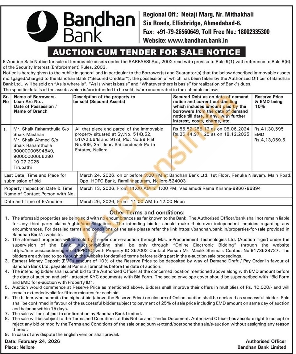 All that piece and parcel of the immovable property situated at Sy.No. 51/8,52, 51/A2,56/B and 91/B, Plot No.89 Flat No.309, 3rd floor, Sai Landmark Putta Estates, Nellore