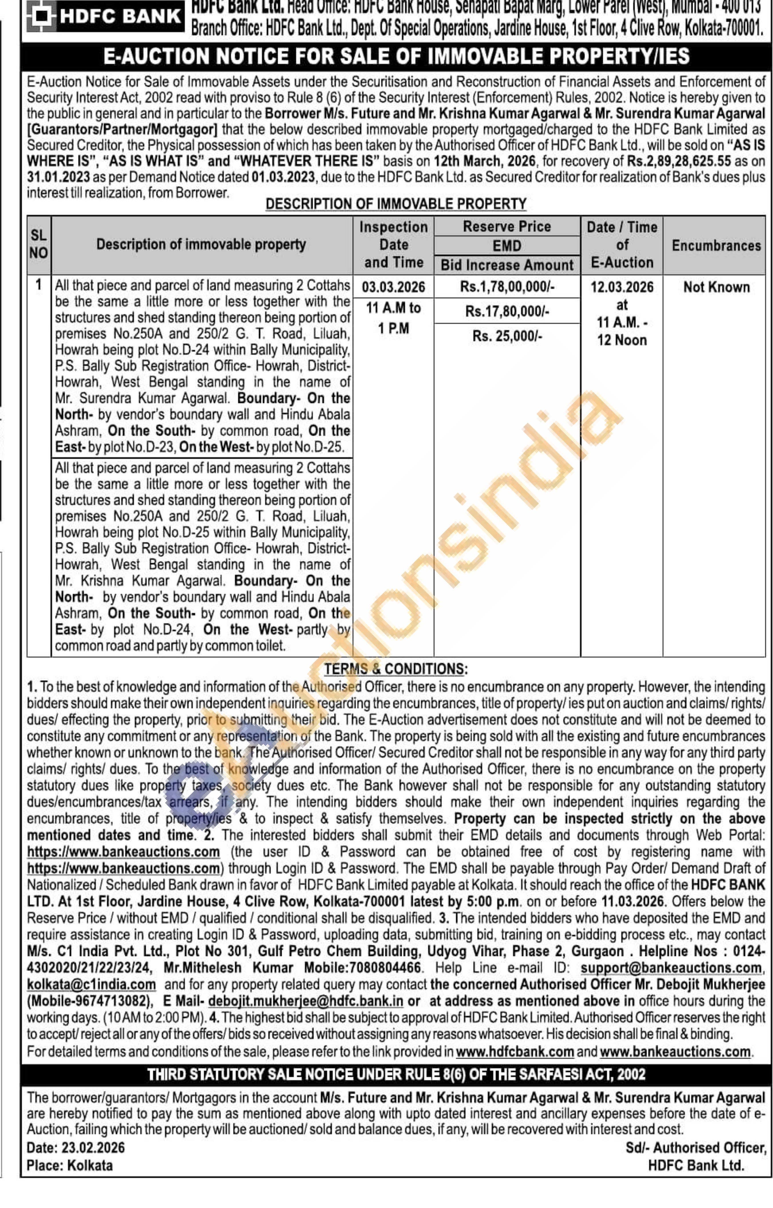 All that piece and parcel of land measuring 2 Cottahs be the same a little more or less together with the structures and shed standing thereon being portion of premises No.250A and 250/2 G. T. Road, Liluah, Howrah being plot No.D-25 within Bally Municipality, P.S. Bally Sub Registration Office- Howrah, District-Howrah, West Bengal standing in the name of Mr. Krishna Kumar Agarwal. Boundary- On the North by vendor's boundary wall and Hindu Abala Ashram, On the South- by common road, On the East- by plot No.D-24, On the West-partly by common road and partly by common toilet.