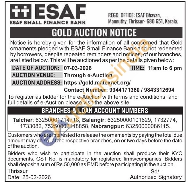 ESAF SMALL FINANCE BANK Gold Auctions Auction in Thrissur