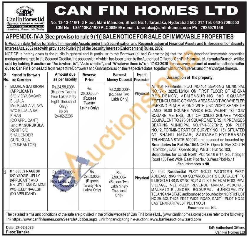 All that Residential FLAT NO.104 BEARING MUNICIPAL NO.17-1-382/B/12/104 ON FIRST FLOOR OF ABIGNA RESIDENCY, ADMEASURING 680 SQUARE FEET, INCLUDING COMMON AREAS AND TWO WHEELER PARKING PLACE, ALONG WITH UNDIVIDED SHARE OF LAND 16.00 SQUARE YARDS EQUIVALENT TO 13.37 SQUARE METERS, OUT OF 329.00 SQUARE YARDS EQUIVALENT TO 275.01 SQUARE METERS, IN PREMISES BEARING MUNICIPAL NO.17-1-382/Β/12, (ON PLOT NO.12, FORMING PART OF SURVEY NO.115), SITUATED AT BHANU NAGAR, SAIDABAD, HYDERABAD TELANGANA STATE-500079 and bounded on bounded by: Boundaries for Flat No.104: NORTH: Open To Sky, SOUTH : Corridor,, EAST: Open to Sky, WEST: Flat No. 103, Boundaries for Land: North: Plot No. 16 & 17, South Sagar Road 150 Feet Wide, East: Plot No. 13, West: Plot No.11
