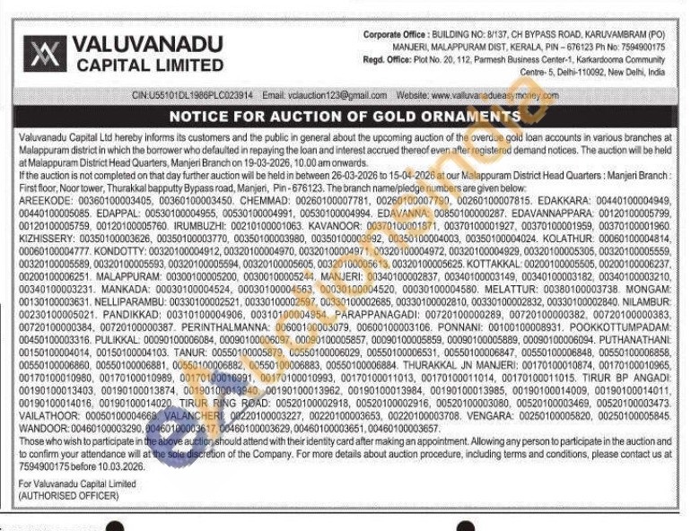 Valuvanadu Capital Limited Gold Auctions Auction in Malappuram