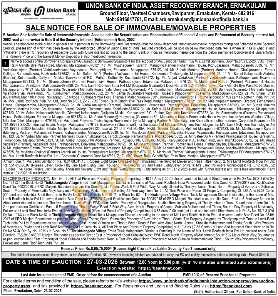 DESCRIPTION OF PROPERTY: Item No: 1: All That Piece and Parcel of Property Comprising of 48.56 Ares (120 Cents) of Land and Industrial Shed there on in Re Sy No. 57/2-1 (Old Sy No. 191/3,4) in Block No.62 Thrikkalangode Village Ernad Taluk Malappuram District, in the name of M/s. Lamit Rooftech India Pvt covered under Sale Deed No. 3798/2017 and Rectification Deed No. 5003/2018 of SRO Manjeri. Boundaries as per title Deed: East: Thodu; West: 6 Feet Width Way Already allotted by Thadiyamburath Trust; North: Property of Azeez and Subaida; South Property of Meembatta Moyinkutty and Poolanchery Pokkarunni and Existing 12 Feet way. Item No: 2: All That Piece and Parcel Of Property Comprising Of 1.65 Ares (4.07 Cents )Of Land and Industrial Shed there on in Re Sy No.57/15-1 (Old Sy No. 191/5) in Block No.62 in Thrikkalangode Village Ernad Taluk Malappuram District is standing in the name of M/s. Lamit Rooftech India Pvt Ltd covered under Sale Deed No. 3798/2017 and Rectification Deed No. 5003/2018 of SRO Manjeri. Boundaries as per title Deed: East: 6 Feet way for use to Aboobacker etc and others and Thadiyamburath Trust; West: PWD road; North: Property of Rajagopalan; South: Remaining Property of Thadiyamburath Trust. Boundaries of Item No 1 & 2 as per Location Certificate: East: 6 Feet way and Thodu, West: Road, 6 Feet Way, Alavi; North: Property of Azeez, Subaida Muhammed and Thodu; South Way Property of Moyinkutty, Pokker and Lamit Roof Tech India Pvt Ltd. Item No: 3: All that Piece and Parcel of Property Comprising of 3.65 Ares (9.00 cents) of Land and Industrial Shed there on in Re Sy No. 57/2-3 (Old Sy No. 191/3,4) in Block No.62 in Thrikkalangode Village Emad Taluk Malappuram District is standing in the name of M/s Lamit Rooftech India Pvt Ltd covered under Sale Deed No. 3816/2017 of SRO Manjeri. Boundaries as per title Deed: East: Thodu: West: Remaining Property of Alavi; North: Thodu: South: The Property Assigned by Thadiyampurath Trust to Lamit Roof Tech India Pvt Ltd; Boundaries as per Location Map: East: Kodali Subaida and Thodu, West: Road, 6 Feet Way, Alavi; North: Azeez, Subaida Muhammed and Thodu, South Way Property of Moyinkutty, Pokker and Lamit Roof Tech India Pvt Ltd; Item No: 4; All That Piece And Parcel of Property Comprising of 3.10 Ares (7.66 Cents) of Land And Industrial Shed there on in Re Sy No.57/4(Old Sy No. 191/1) in Block No.62 Thrikkalangode Village Ernad Taluk, Malappuram District is Standing in the Name of M/s. Lamit Rooftech India Pvt Ltd covered under Sale Deed No. 783/2018 of SRO Manjeri. Boundaries as per title Deed: East: Property of Kodali Subaida; West: PWD Road; North: Property of Muhammed; South: 5½ Meter Width Way, Boundaries as per Location Map: East: Property of Kodali Subaida and Thodu; West: Road, 6 Feet Way, Alavi, North: Property of Azeez, Subaida Muhammed and Thodu; South: Way Property of Moyinkutty, Pokker and Lamit Roof Tech India Pvt Ltd