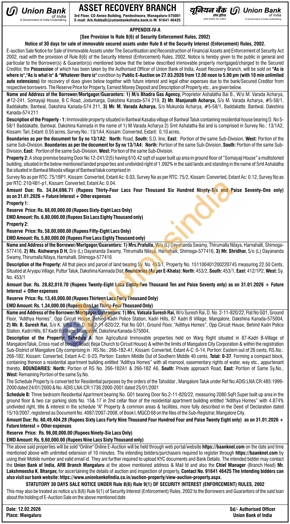 Description of the Property: All that piece and parcel of land bearing Sy. No. 453/1, Property No. 151100401200220745 measuring 22.50 Cents, Situated at Aryapu Village, Puttur Taluk, Dakshina Kannada Dist. Boundaries (As per E-Khata): North: 453/2, South: 453/1, East: 412/1P2, West: Sy No. 453/1